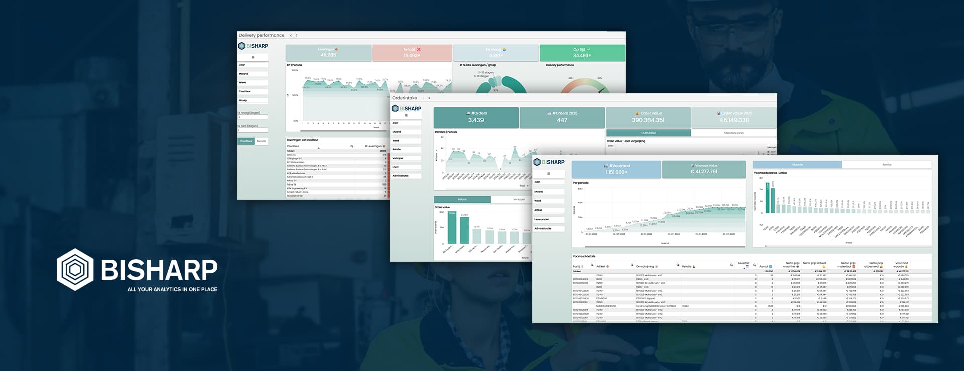 Bisharp is ontstaan uit jarenlange BI consultancy in de maakindustrie. Alle belangrijke KPI’s voor maakbedrijven zijn standaard aanwezig en worden constant geoptimaliseerd. Dankzij de branche specifieke focus is de implementatie snel en eenvoudig. Zonder grote investering beschik je direct over een compleet cloud-based BI platform.